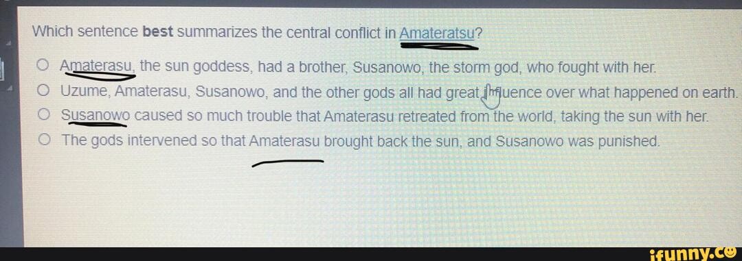 . Which sentence best summarizes the central conflict in Amateratsu. Amaterasu the sun goddess had a brother Susanowo the storm god who fought with her. Which sentence best summarizes the central conflict in ameratsu.